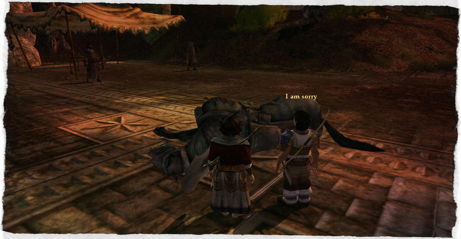 That was no picnic. There indeed were trolls but not like the rocky ones, these were hunchbacked and their skin was already grey like stone - at first I had to look for long time before I found out they were real and VERY ALIVE. Luckily we are hobbits, tiny and incospicuous (whenever we're not drinking), skilled in sneaking unnoticed and masters of hiding. Step by step, gasp by gasp we ambled until the ruins, a rocky gate and the tall people with grim faces and crimson robes ... I noticed a horse lying behind the gate, it was Silas - with an odd blanket on his back, but it was him! I ran to the small horse lying there and Tahi followed me ... he was dead already, nothing could have been done and it was daunting, my mischievous, immensely self-willed friend lying there deceased and all the men around the ruins noticed us ... we had to flee for our lives and I lost Amorey's map in all that hassle.