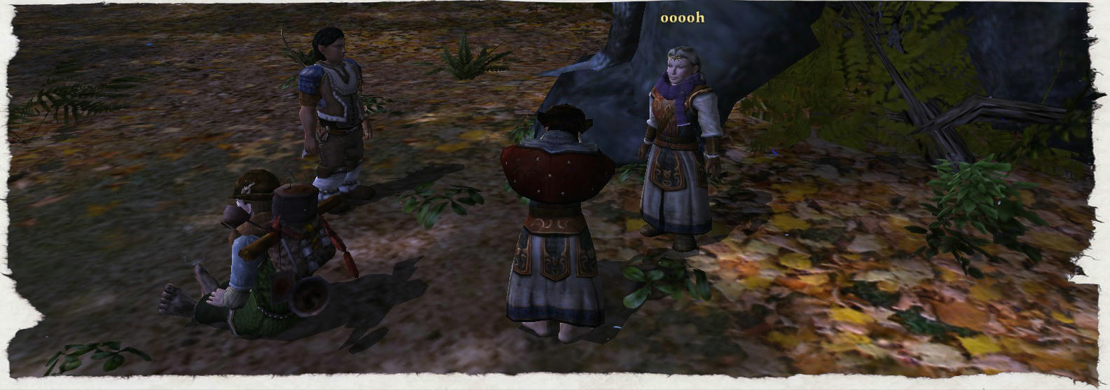 The sun rising in distance drew our attention - the sky was all purple and light pink, stars already disappeared yet still we could not see the Sun itself. "What are we looking at?," asked Tukko. Typical lad, no sense of beauty inside the brainpan. On the other side of the bridge there was standing a fair Elf maiden, looking quite noble to me ... not the first time when I wished to be an Elf too. I understood no word of her language but there was no malevolence in her face so we continued swiftly to south-east. There we found a place good for camping under the escort of an Elf and a Dwarf. I always thought (after listening to masters Barkgrim and Asudrom ) that dwarves do not enjoy the company of elves but I might have been mistaken. "Welcome, mellyn" said the elf with a serene appearance that soon calmed most of us down. I think Amey still looked somewhat troubled but I let it be, she would tell me if she wanted to. We stayed there for the next day and night, resting and eating the leftover porridge of which taste had turned to bland and rather unpleasant. With longing I can only try to remember the wonderful warmth of the freshly made porridge, its recipe travelled faithfully with me all the way from the Shire to these dangerous parts of Eriador.