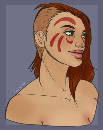 | Outward Appearance | A tall muscular woman, standing at 6'1, with well defined muscles. Her hair is a dark red, nearly a brown colour, and is shaved on the right side. The rest is pushed over to the left just touching her shoulder, a braid going down the partition. Often her hair falls out of place, especially in wind. Surrounding her right eye, is a matte red tattoo, a series of thick, curved lines coming away from the eye, making a swirl. Her green-yellow eyes have lost some of their youthfulness, and now display a degree of weariness. Under her eyes are a small amount of freckles.