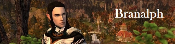 | Outward Appearance | Branalph has the black hair and grey eyes of most Noldor, as well as the striking height of one born in the First Age of the Sun and Moon. The black and white tabard covering his chain hauberk would be instantly identifiable to Imladris residents as that of the Order of the Hammer of Vanimar. Branalph listens more than he speaks, but cannot always hide his reactions -- often a smirk or laugh, contrary to his otherwise severe appearance. His voice is oddly soothing for someone in his profession. |