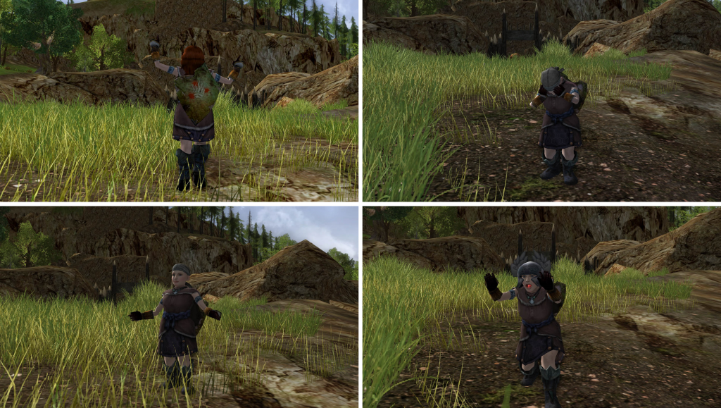 Livin’ out every Hobbit-child’s dream we rolled in dirt, smearin’ mud all over our faces, till we was grubby as pigs. Screechy Gobbo clothes smell riper than Barrow Brie. An’ their helms be the most uncomfy headwear I ever wore. But as our curly hair would give us away, we grit our teeth, wrapped big hankies ‘round our heads, put the unwieldy helms on, an’ armed ourselves for the foray.