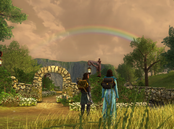 Earlier in the day, the Hobbits might have caught a glimpse of Ristiinnä walking merrily through the rain along the lane out of Budgeford, with a husky at one hand and a great brown bear at the other, and thought her a great wizard. But by time she reached Scary, the bear seemed to be gone, the woman she'd been traveling with earlier was returned, and as the rains broke, hand in hand they watched the sky fill with color.