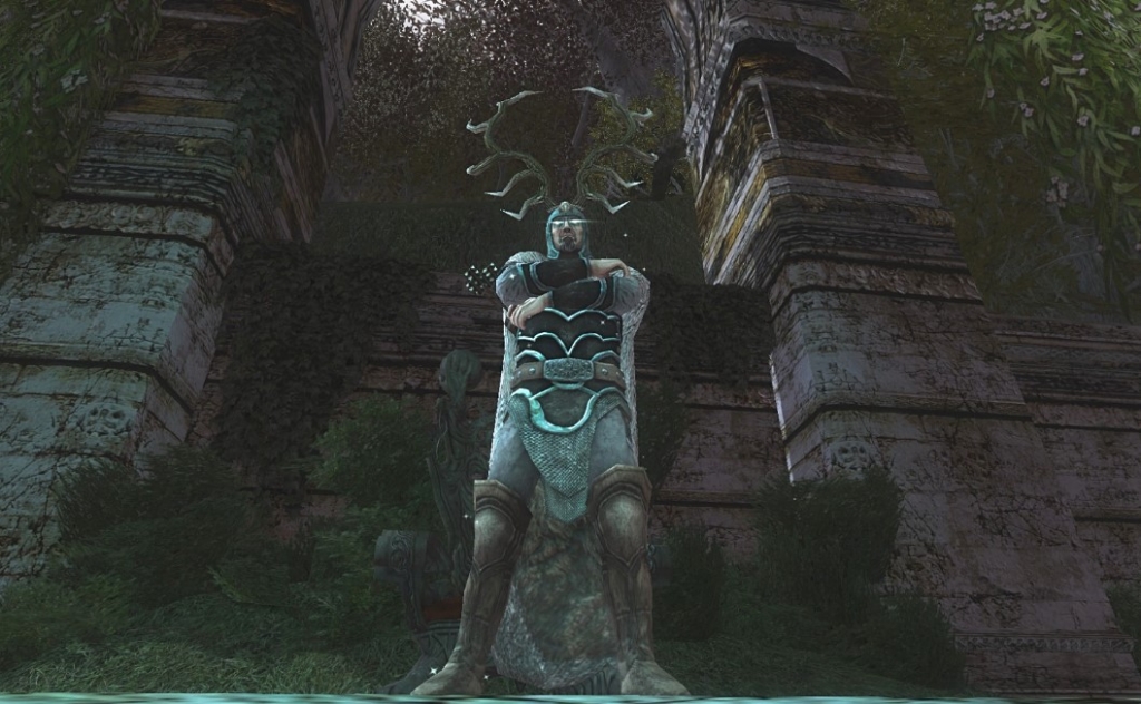 'At the top center of the dais were a man of giant proportions. He were two or three times the height of the tall river-maidens, and many times taller than Beannaithe.