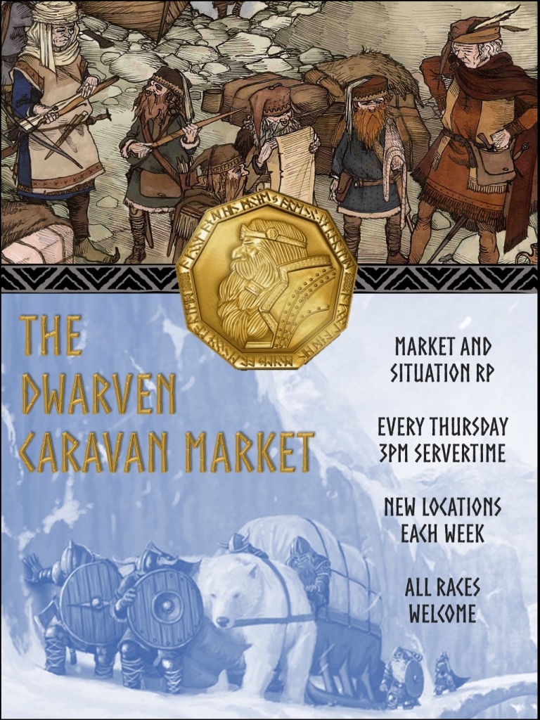 This Week's RP Situation: Tragedy has struck Needlehole! The Dourhands have orchestrated a most cunning scheme. Their captured “spy” had said to the guards of Gondamon that the Dourhands were planning an attack on Lindon, only to divert their attention away from Needlehole. Then in the darkness of night the Dourhands raided Needlehole and stole much of the Longbeard gold that was stored there. Ulfar is distraught at what has transpired, but he vows to do whatever he must to reclaim the stolen gold and get his revenge on the Dourhands. Ulfar is enlisting all the help he can get in tracking down these Dourhand brigands. Perhaps the Dwarven Caravan Market can offer some of this help as it visits Needlehole.