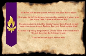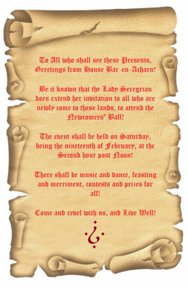 Therefore, Lady Seregrían of Torech Besruth is pleased to announce that Bar-en-Acharn shall host the Newcomers' Ball, and invites all friends and companions both far and wide to attend and enjoy rollicking fun and welcoming to these lands!