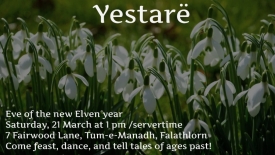 Come celebrate the eve of spring and the new year with the Elves of Lósengriol! Elves and Elf-friends who find themselves in Imladris on this date are invited to drink wine and enjoy the warmth of the new year.
