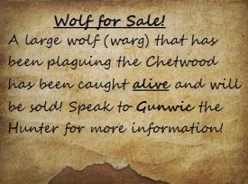 A large wolf/warg was caught by the hunters Gunwic and Ivyan, they are now selling it on for what ever purposes someone might have with it aslong as it is the right coin.