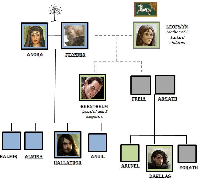 In Gondor the father of Fernmir chose Lady Anora as his bride, after marriage he had four children with her. The second child and first son with Anora was Hallothar.