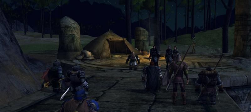 Once the guard reported a group of wanderers passing by south I was surprised but reluctant to get involved. We had closed our gates to foreigners, other than those seeking business for the moment. Yet they did not walk to our gates but headed further down south. After a few days, orcs were sighted close to Othrikar, they must have passed from eastern Nan Amlug region. Their number were too few to cause any direct threat, yet it was an uncommon sight. Not much later I received reports that those same wanderers were assaulted by the orcs, and as a result we locked up Othrikar as a solid brick expecting a strike on our outpost. A strike that never came. After a few days the orc threat diminished, no doubt due to the Rangers. Once the order seemed restored I marched out with a handful of guards and the two mercenaries to find what was left of these strangers. All we found was a bloodbath, many corpses of orcs and men. As we examined the orc corpses it was likely these orcs belonged to the eastern tribes. We followed a trail of footprints leading off to the road west in northern Kingsfell. The sun was falling, and coming close to edge of the forest of Annundir we saw a light in the distance. Upon closer inspection we found their encampment upon an old ruin of elder kingdoms of men.