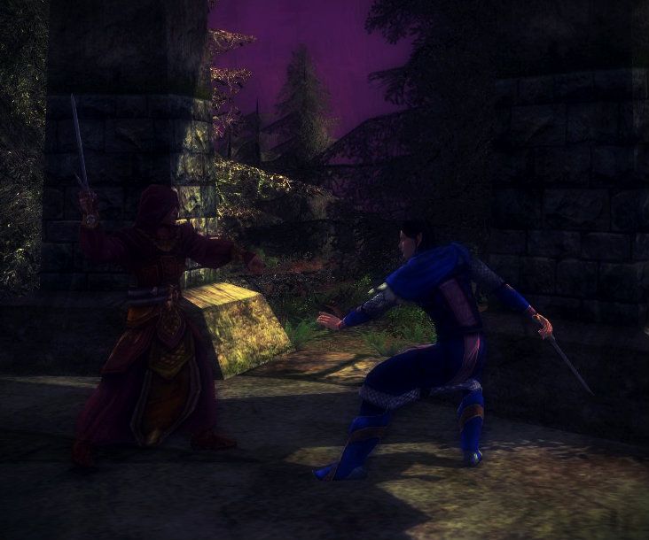 He walked up an old stairway and saw a green round courtyard surrounded by ancient pillars. Armanduil stood still looking around for any sign of life. A chill wind passed over his neck, and blew around the courtyard. Armanduil saw an odd moving darkness, passing the pillars into his direction. Before it hit him, Armanduil dodged away in time as the shadow passed before him, from the shadow a whispering of some dark language could be heard. He drew his blade, as the shadow halted in the center of the courtyard. A sinister laughter filled the ruin as men hooded and robed appeared from the shadows. They wielded blades and their faces were hidden, six of them encircled the shadow at the center all with their faces hidden. The men turned to face Armanduil, the tallest of them approached him slowly with a long blade in his hand.