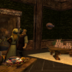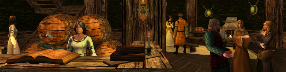 The smell of freshly-cut pine mingles with hot baked barley bread and cherry pottage. The crackling of well-stocked fires, coupled with the sputtering of fresh wax candles, mingles with footsteps throughout the house. A fair voice rises from the counter, and the delicate mewing of a cat, appearing out of nowhere, welcomes everyone to the Sickle and Sword.