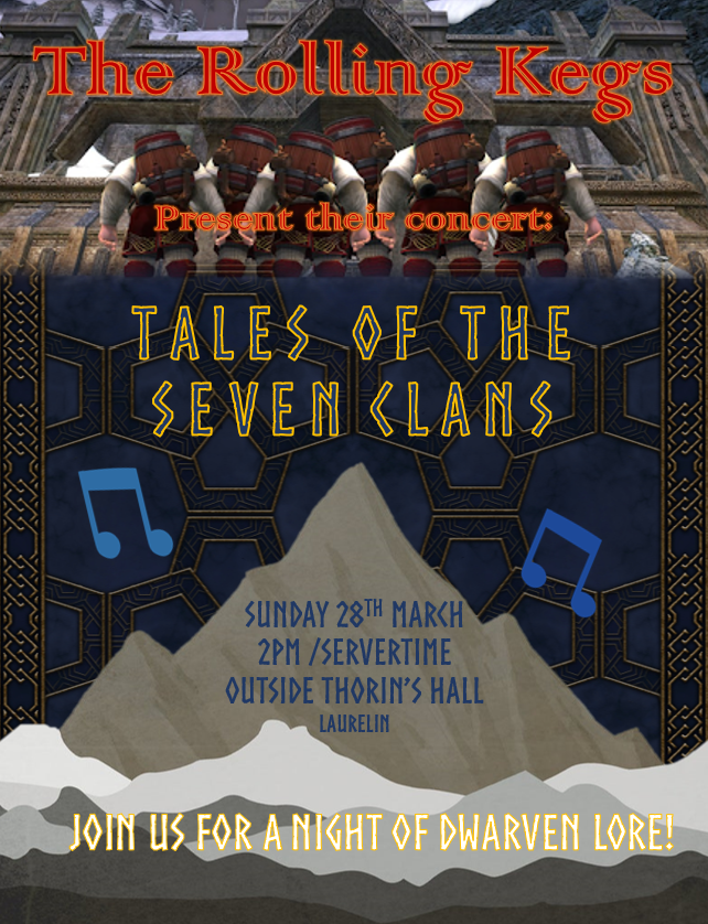 Come and listen to an hour of mighty music with the Rolling Kegs, telling tales from the long history of the dwarven clans! All are welcome (even those lacking in the beard department).