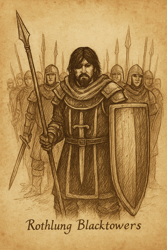 During his years of service, Rothlung quickly rose through the ranks of the Bloody Dawn, making both friends and foes among his own people. His tactical mind and unwavering resolve earned him the rank of Captain. He was often seen in Bree, bearing his massive tower shield marked with the company’s crimson sunrise emblem — a symbol that would become synonymous with his name.