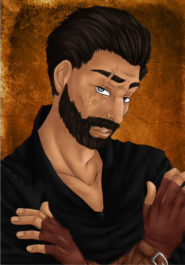 | Outward Appearance | Blince's build is what gives away that he is, or used to be, a soldier. His great wide shoulders and his scarred, though fairly well built arms would pretty much make it obvious that he's a soldier. His scarred, and unusable eye is probably the most obvious feature to catch someone's eye. His stance even when casual is straight, very reminiscent of his militaristic past. Although seeming to have a serious background Blince switches between being a serious, no jokes person. To someone who will prank everyone in the room because he's being left out of a conversation. He's often seen with his travel worn blades and a smirk on his face.