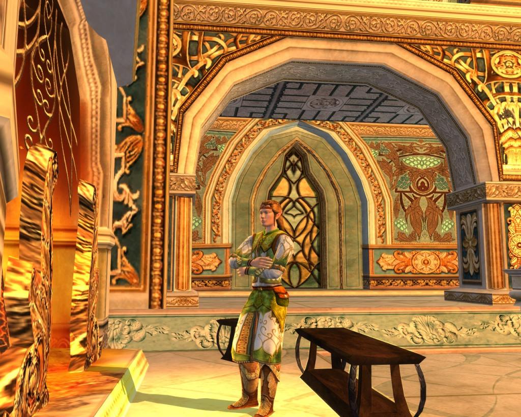 | Outward Appearance | This elf's tall stature is unusually thin in form compared to most of his kin. He stands and moves gracefully and very proudly, holding his head high in most cases. His deep green eyes shine like polished emeralds and reflect great curiosity within them. His light-brown hair is almost always kept in an intricate style, with both braids and leather bands to keep it together. The garments that he wears are always of elven make and richly adorned with embroidery, most commonly with leaves and other motifs of nature. |