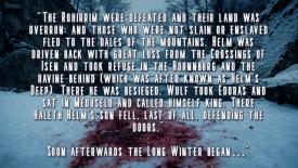 Text: “The Rohirrim were defeated and their land was overrun; and those who were not slain or enslaved fled to the dales of the mountains. Helm was driven back with great loss from the Crossings of Isen and took refuge in the Hornnburg and the ravine behind (which was after known as Helm’s Deep). There he was besieged. Wulf took Edoras and sat in Meduseld and called himself king. There Haleth Helm’s son fell, last of all, defending the doors.”