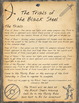 There is a tournament happening soon. A test of skill with blades, bows and even fists! It will be lead by the second-in-command and champion of the Black Steel: the shieldmaiden Gæded, who is reknowned for her combat skills within her company. Come along to the Thirsty Boar to find out more...