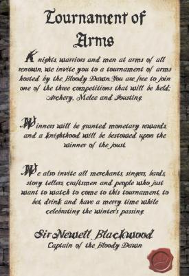 There is a tournament happening soon. A test of skill with blades, bows and even fists! It will be lead by the second-in-command and champion of the Black Steel: the shieldmaiden Gæded, who is reknowned for her combat skills within her company. Come along to the Thirsty Boar to find out more...